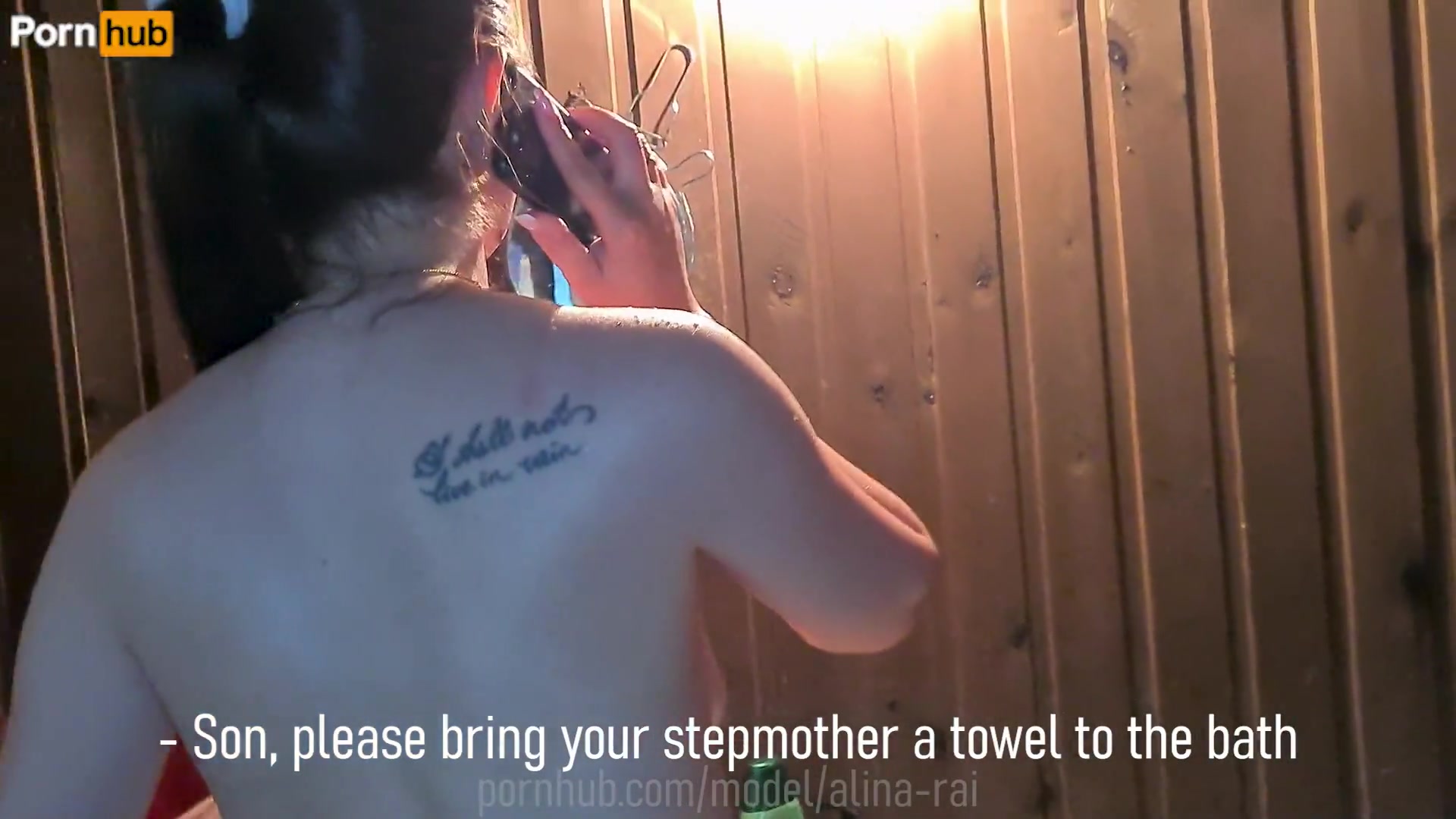 Русская мачеха забыла полотенце когда пошла мыться в русскую баню и ей пришлось звонить своему пасынку, чтобы он принес это самое полотенце.