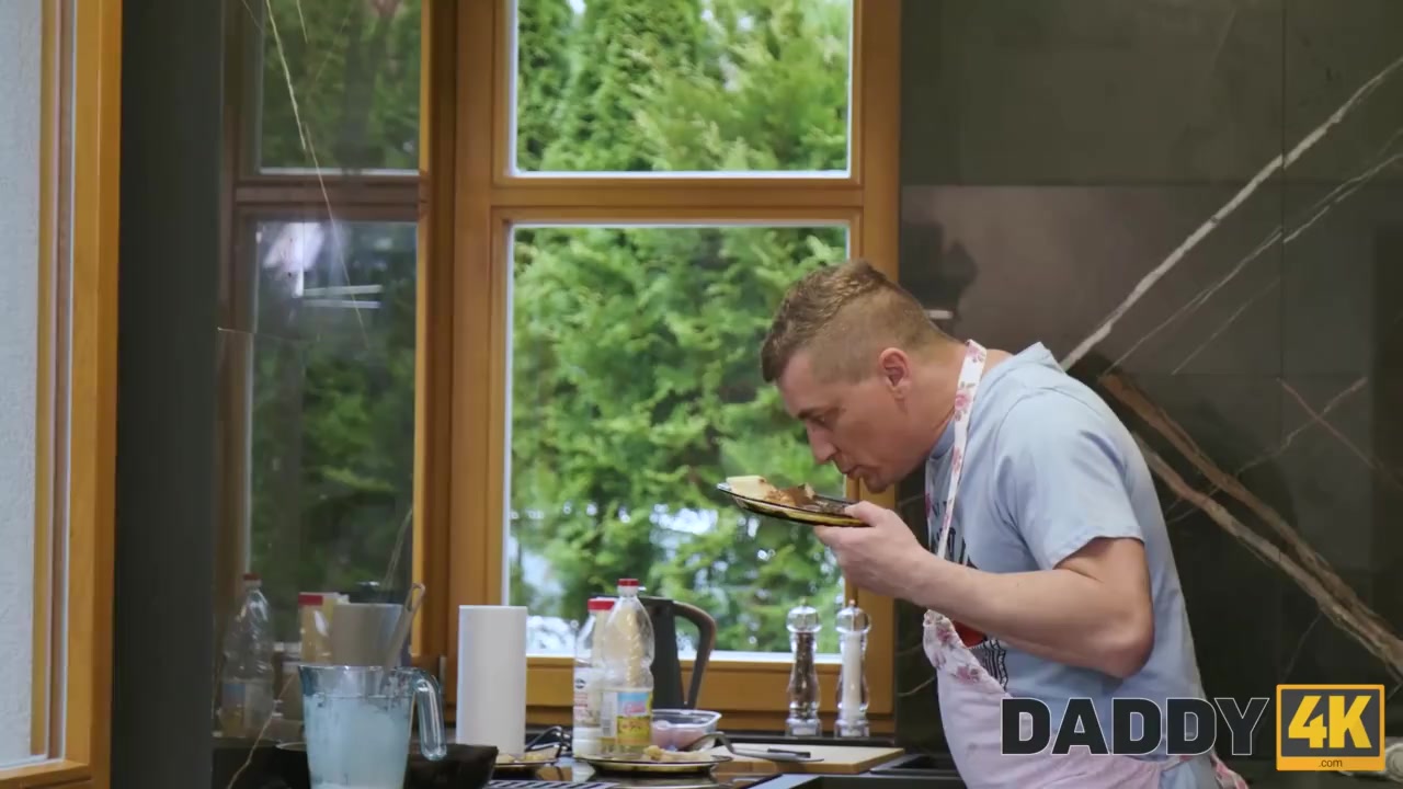 Я поменялся фартуком со своим сыном и его девушка, по ошибки отсос ала мой член под столом. Но мы так возбудились от этого, что дело минетом не закончилось.