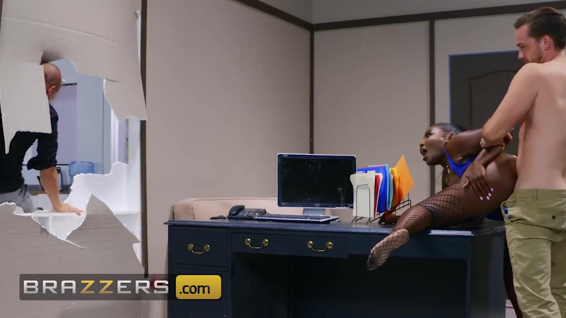 Негритянка застряла в офисе и вместо быстрой помощи, её коллеги трахнули застрявшую негритянку, но негритянки это даже понравилось.