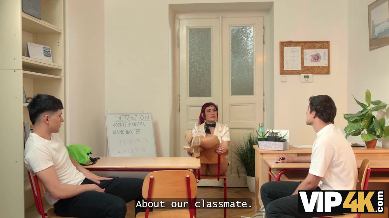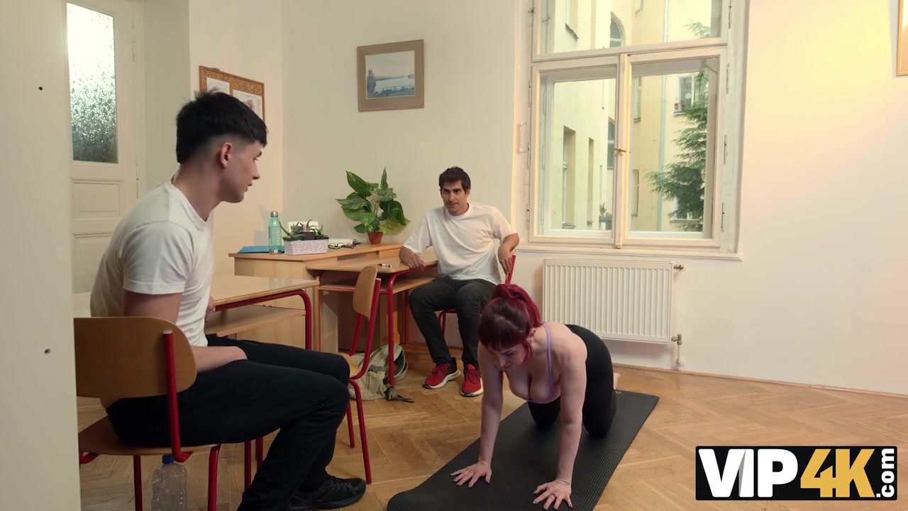 Американская преподша решила проучить непослушных студентов и поднять их успеваемость своей властной киской и большими сиськами.